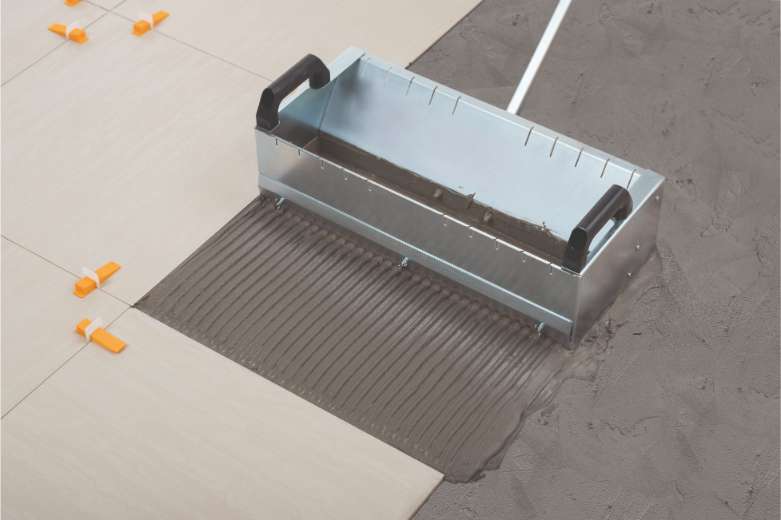 It features a large loading capacity and includes four interchangeable notched blades with dimensions of 5/16″ x 5/16″, 13/32″ x 13/32″, 15/32″ x 15/32″, 24″ wide and R10, allowing adjustments according to tile size and installation requirements.