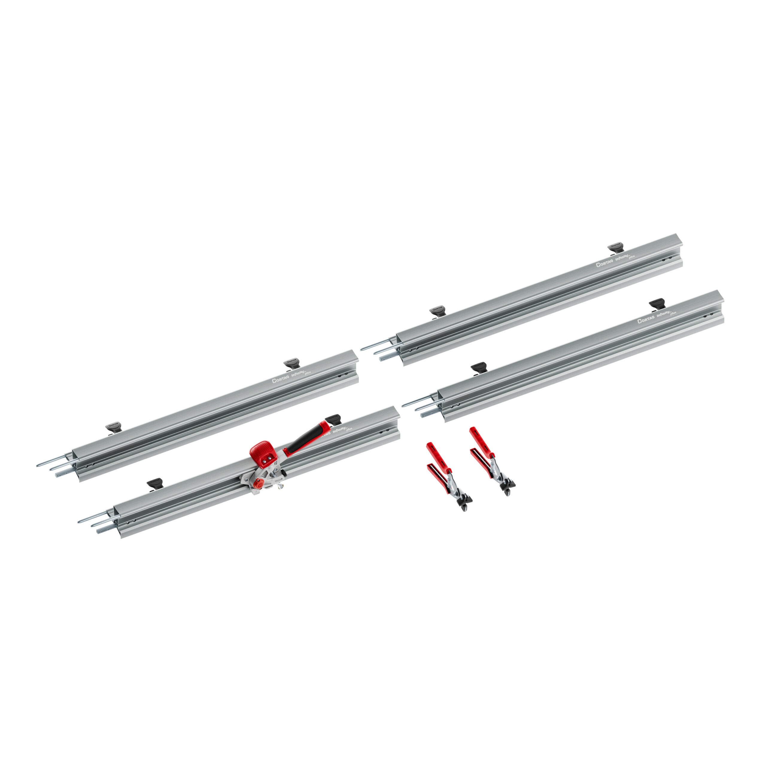 - Sistema de união dos trilhos com pinos e barra quadrada, garantindo estabilidade e precisão no corte.